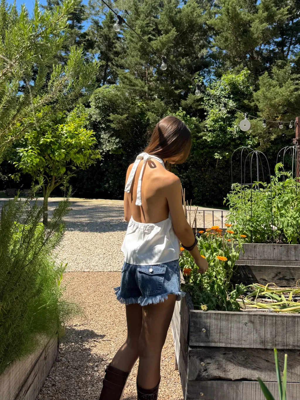 Top de lino escote halter. Se ata al cuello lo que hace que lo puedas regular como te quede más comodo! Tiene elástico en el bajo busto y espalda, terminación en volado amplio. Forrería a tono en la parte del busto :)