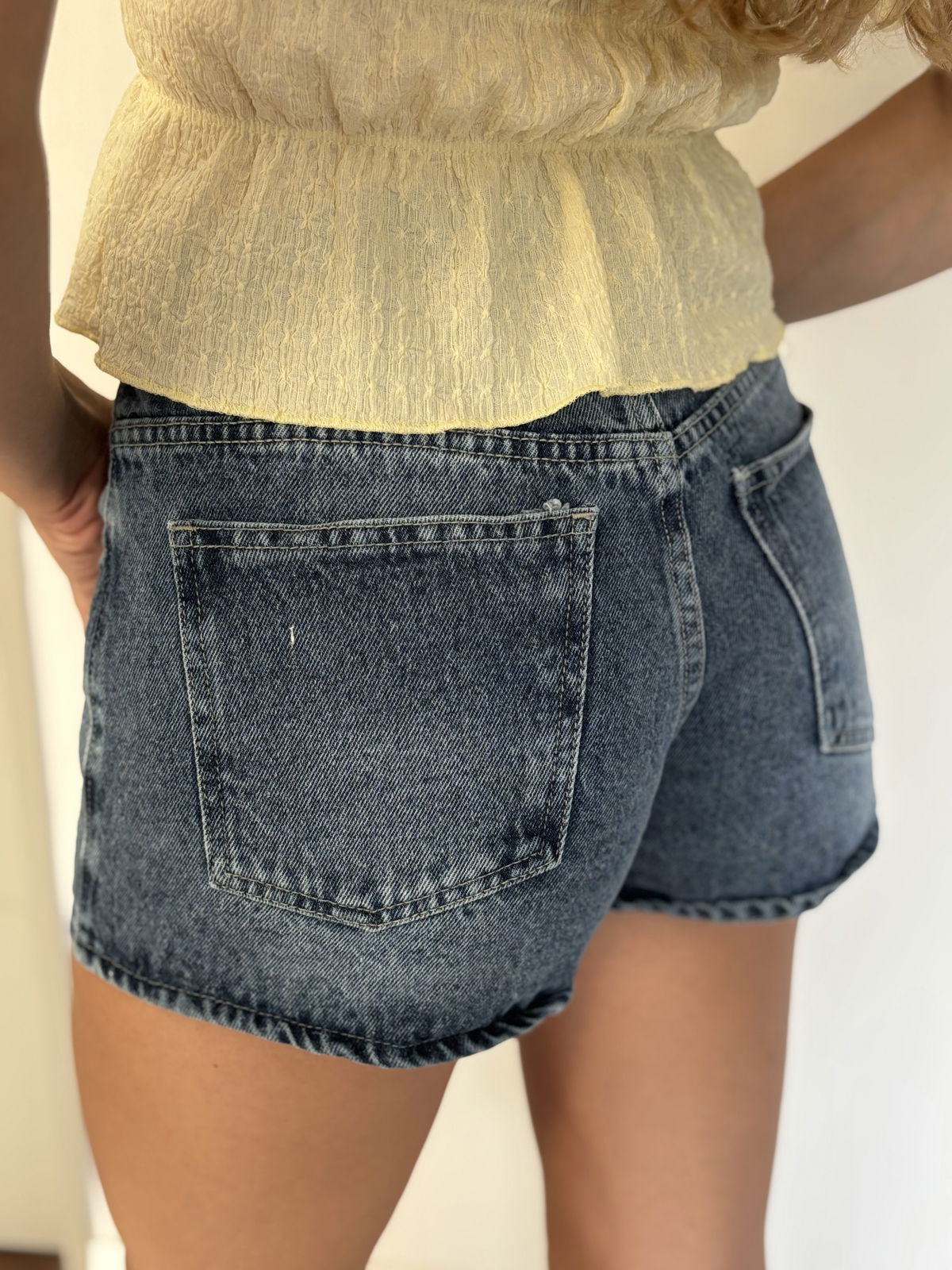 Short tiro medio denim azul, la modelo usa talle 36 :)