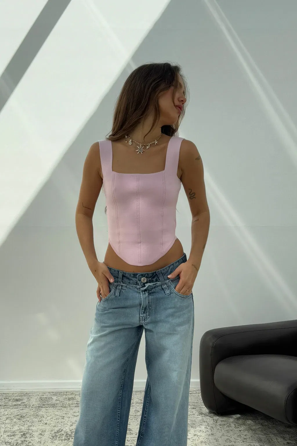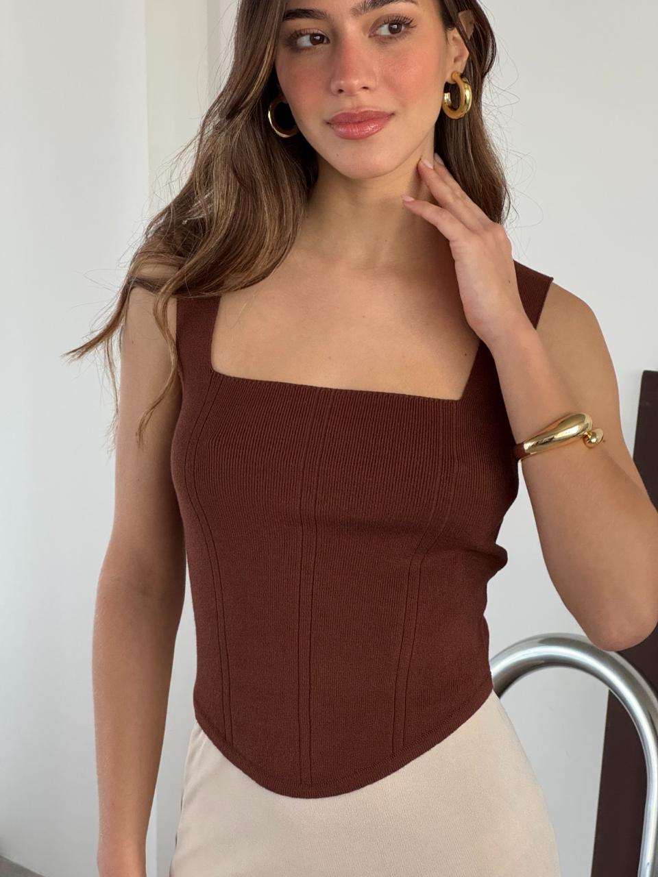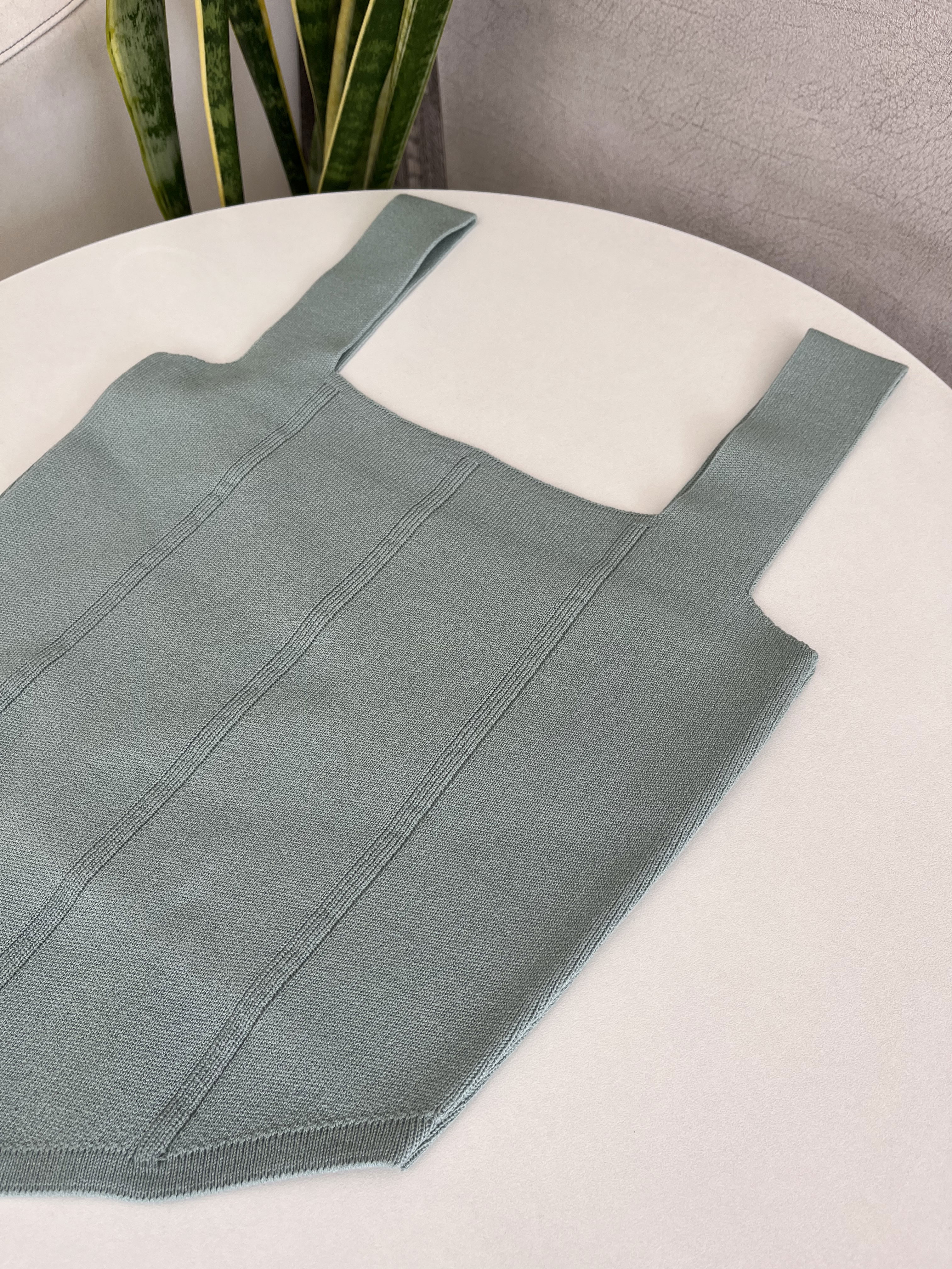 Top tejido tipo corset con puntos finos y detalles de punto diferente en líneas verticales. El escote es levemente recto, con breteles anchos. Super cómodo, fresco, versátil y 100% un summer item que tenés que tener. El tejido es elastizado y cede, calidad premium!
