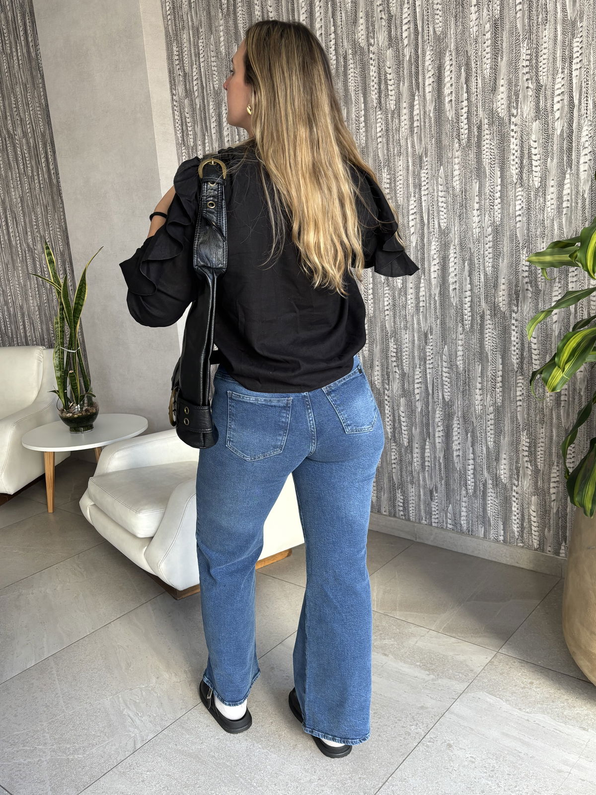 Wide azul tiro alto elastizado con re buen calce, la primera modelo usa talle 36 y la última modelo usa talle 40!