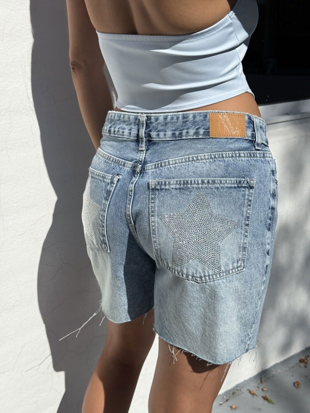 Short largo rígido con estrellas en strass en bolsillos traseros.