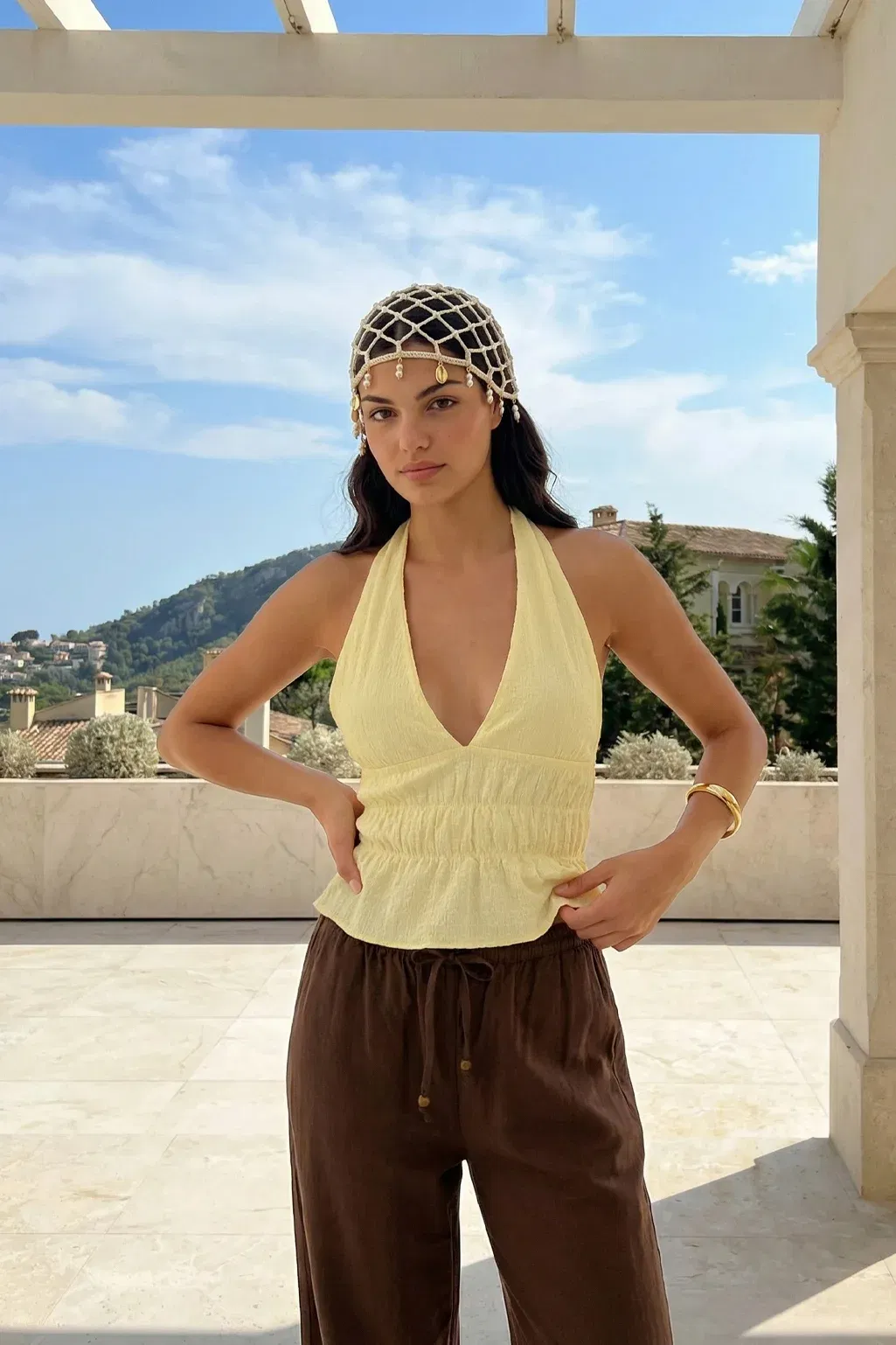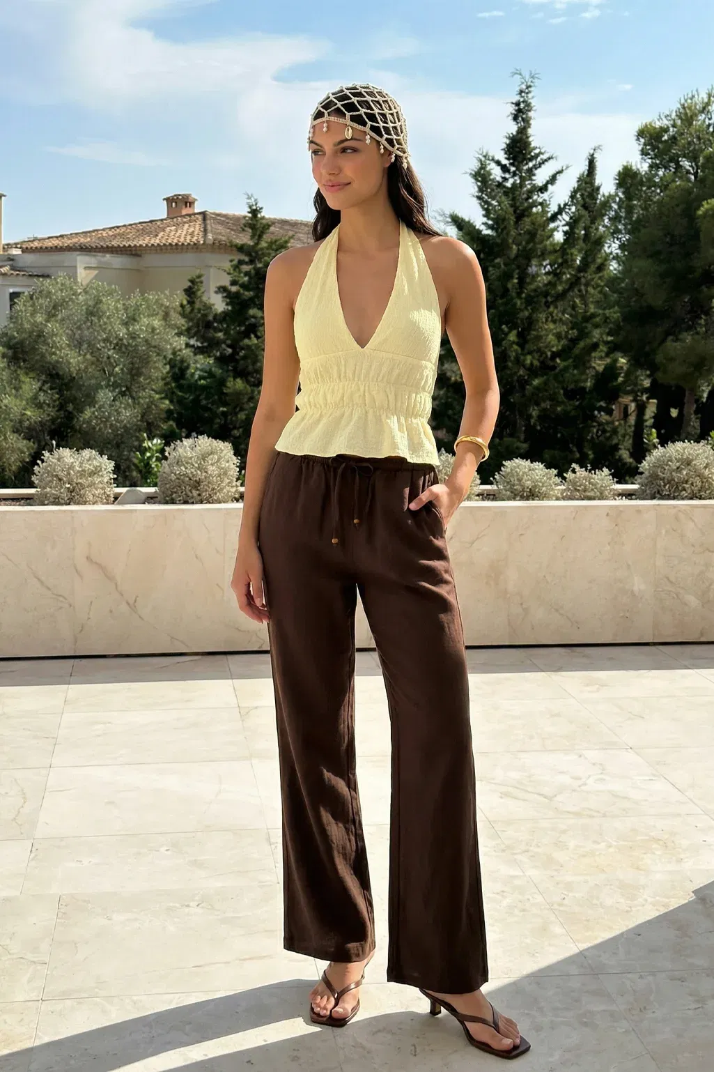 Top de bambula hawai con escote halter que se ata al cuello y frunces en la cintura. Tiene forrería de morley a tono en la parte del busto para más comodidad!