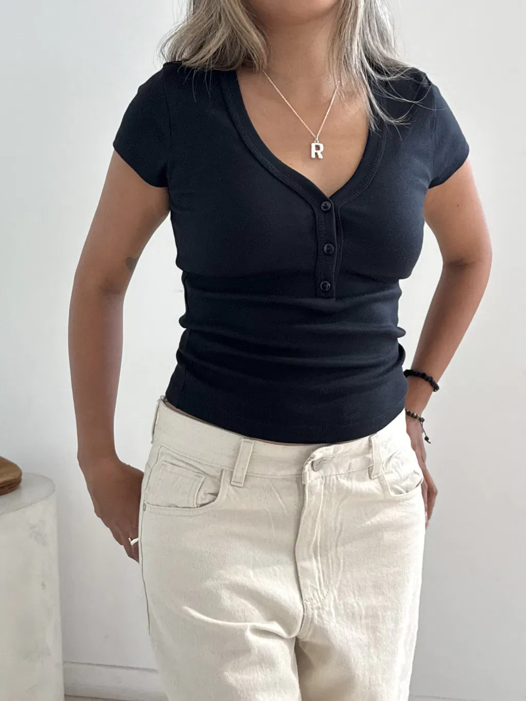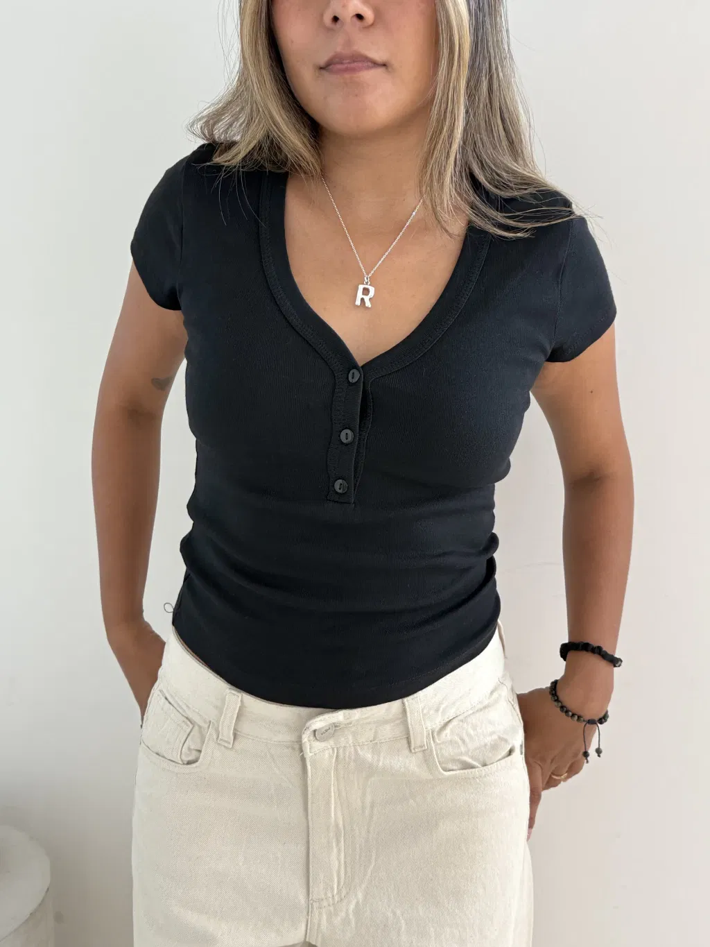 Remera de algodón elastizado con escote en V y detalle de tres botones al frente. Talle unico, las medidas aproximadas son: