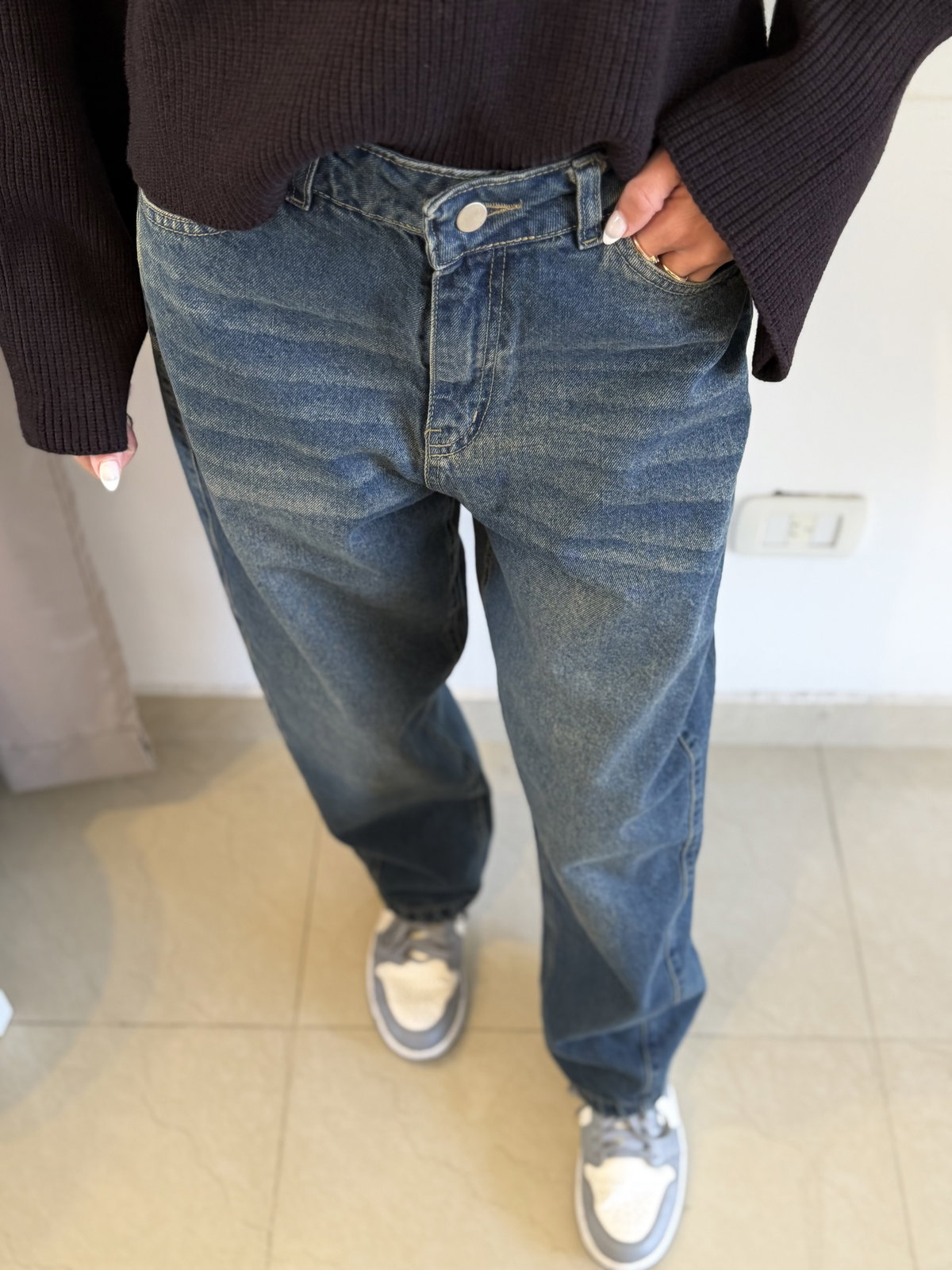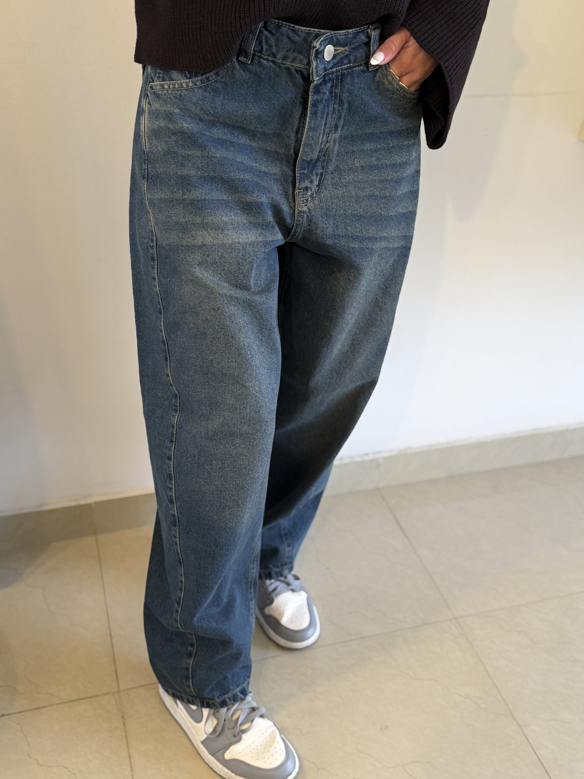 Baggy barrel azul matizado con detalle de recortes en la pierna super canchero :)