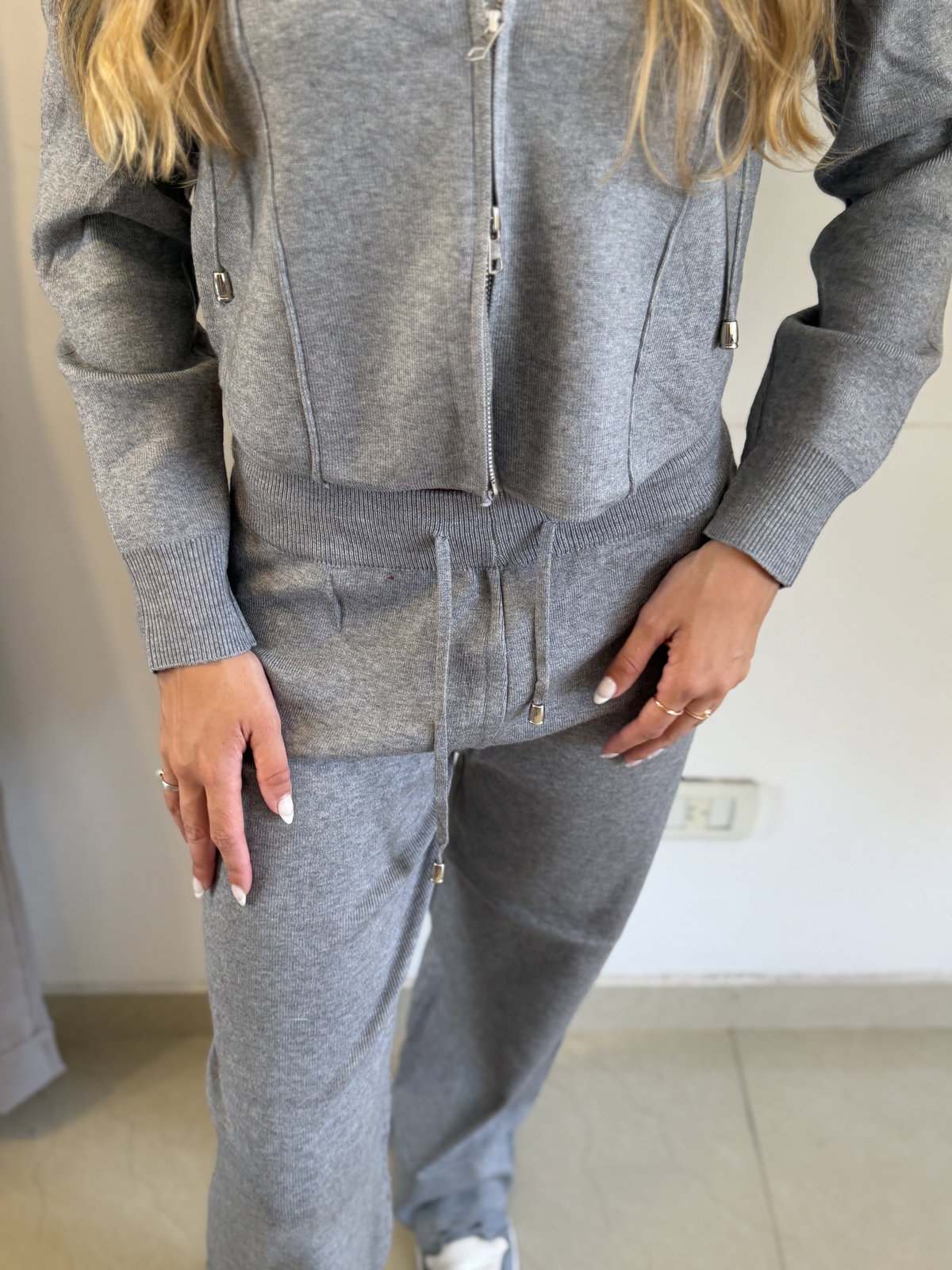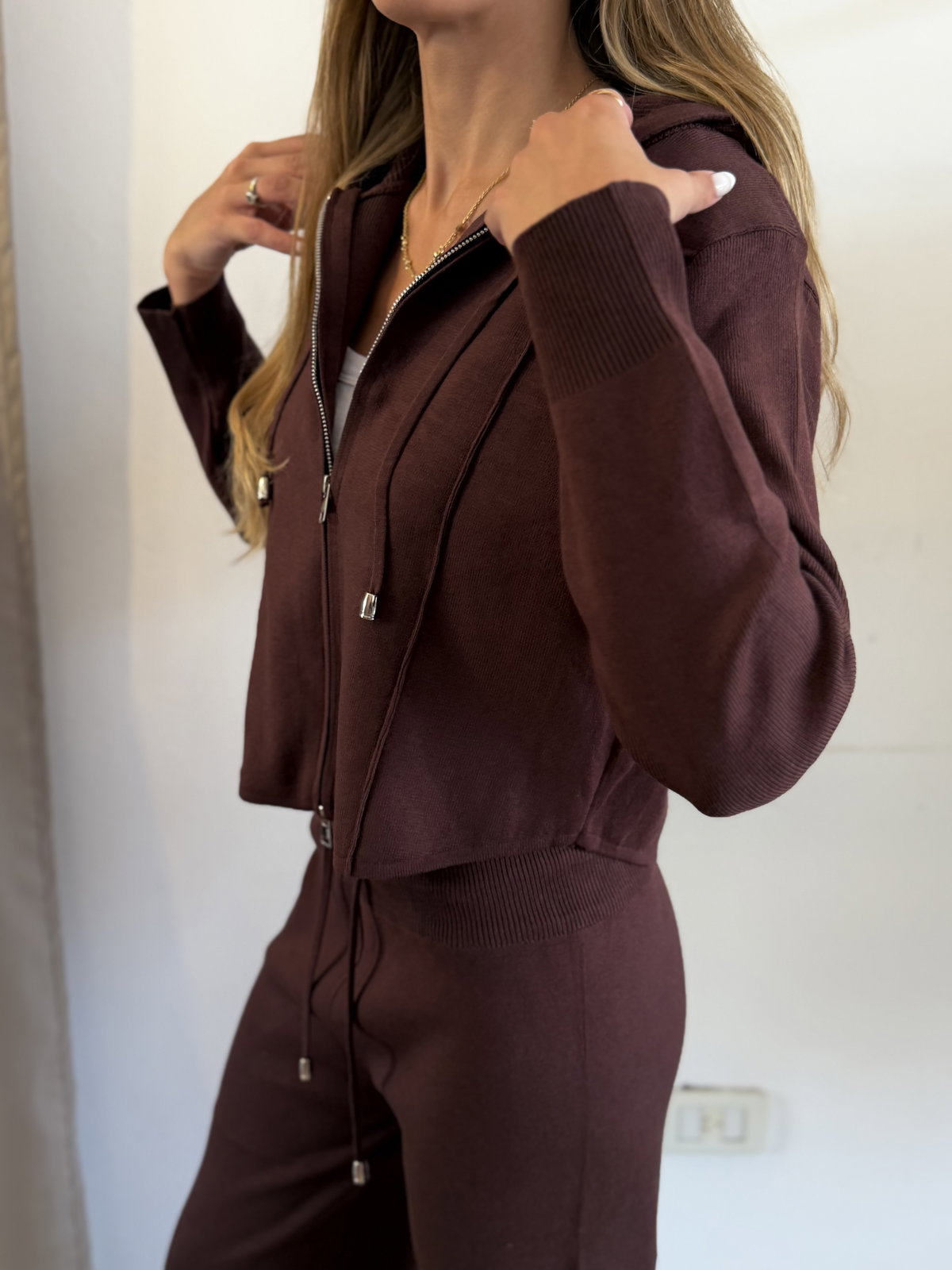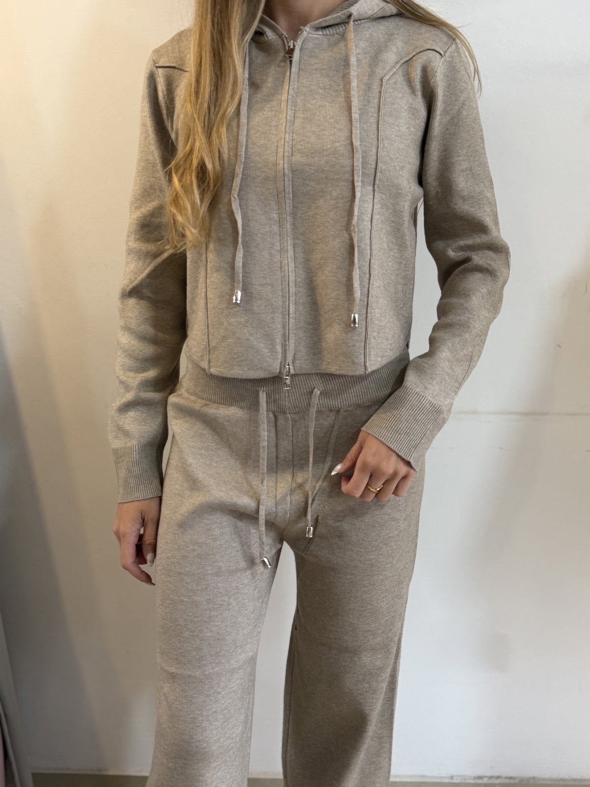 El set incluye: campera doble cierre con capucha + pantalón wide leg.