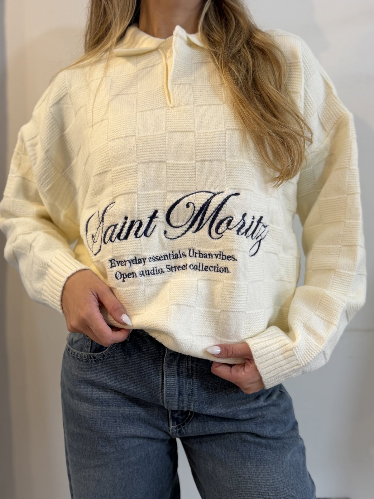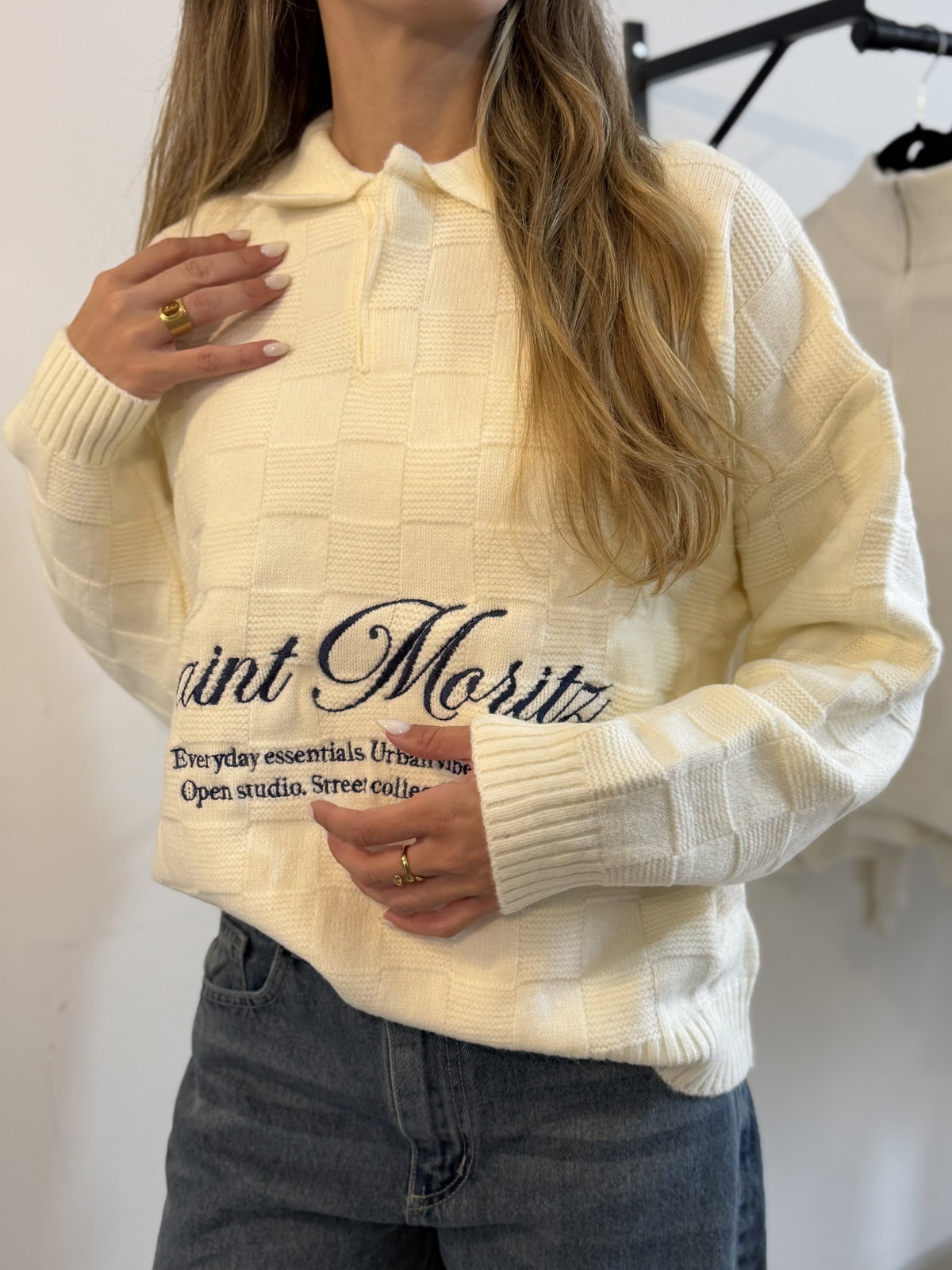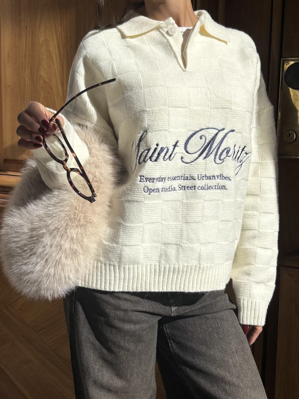 Sweater polo oversized con tejido a cuadros texturizados y bordado delantero.
