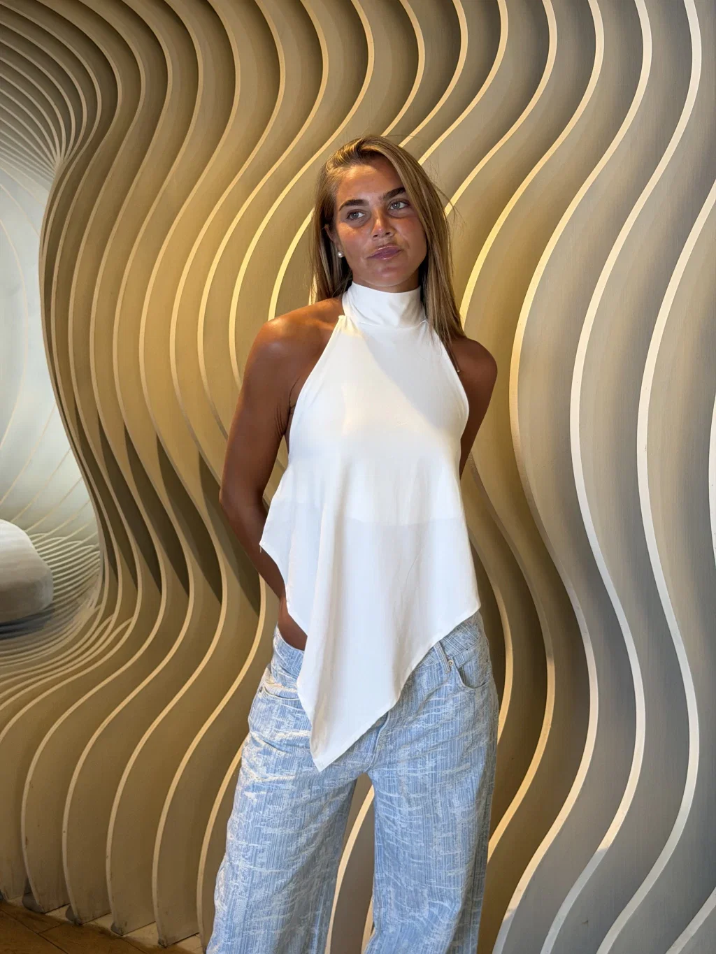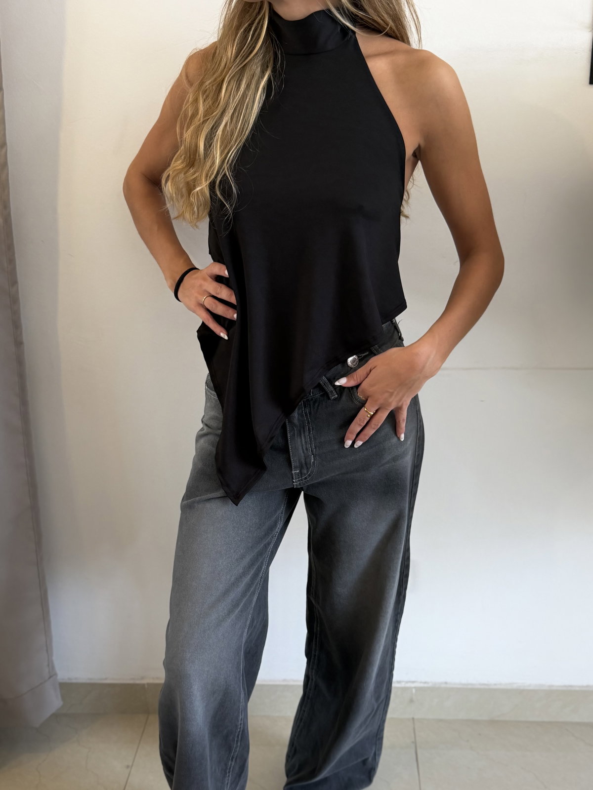 Top confeccionado en microfibra con cuello halter alto, espalda descubierta y asimétrico. Doble tela en busto, no transparenta.