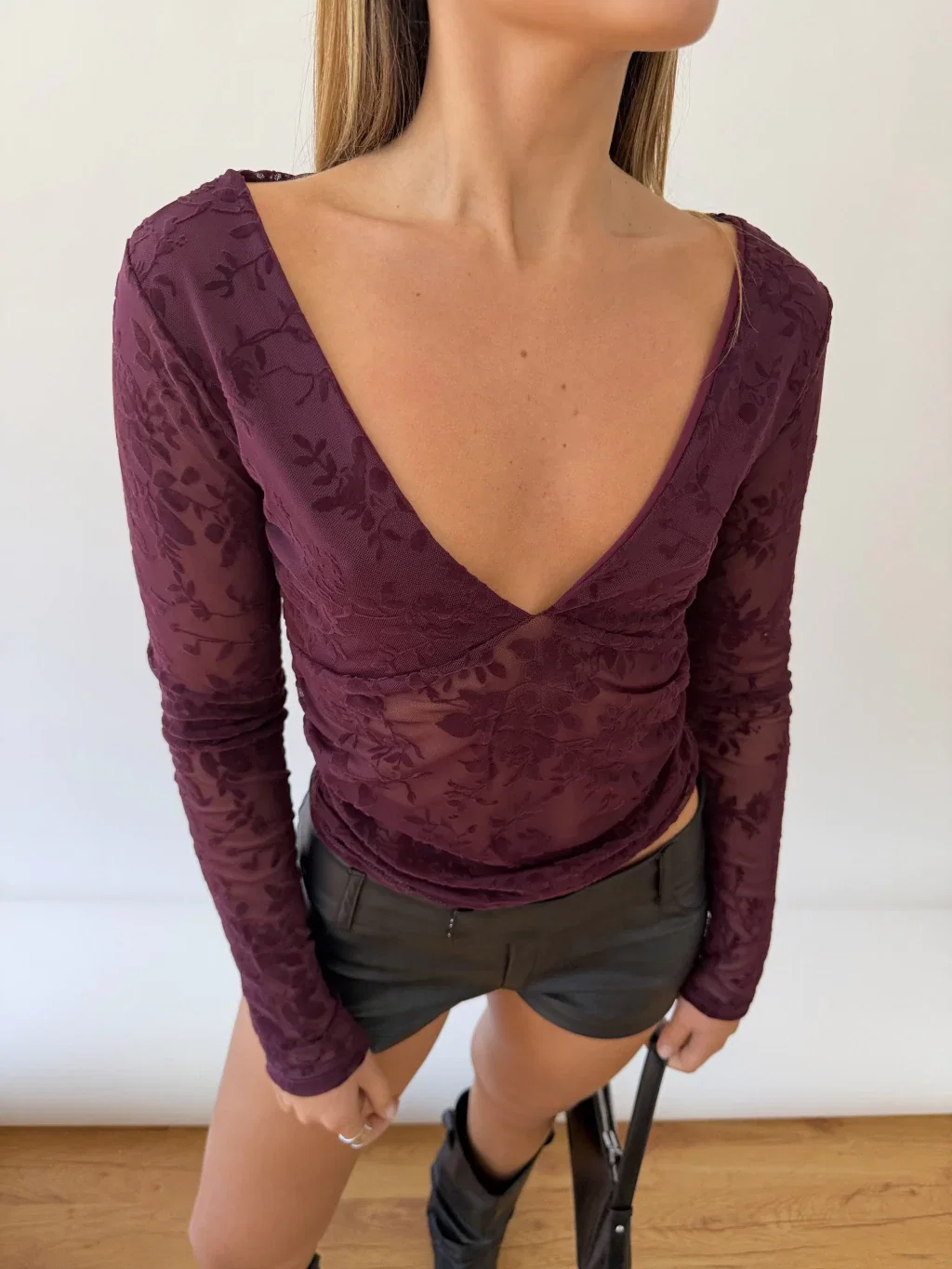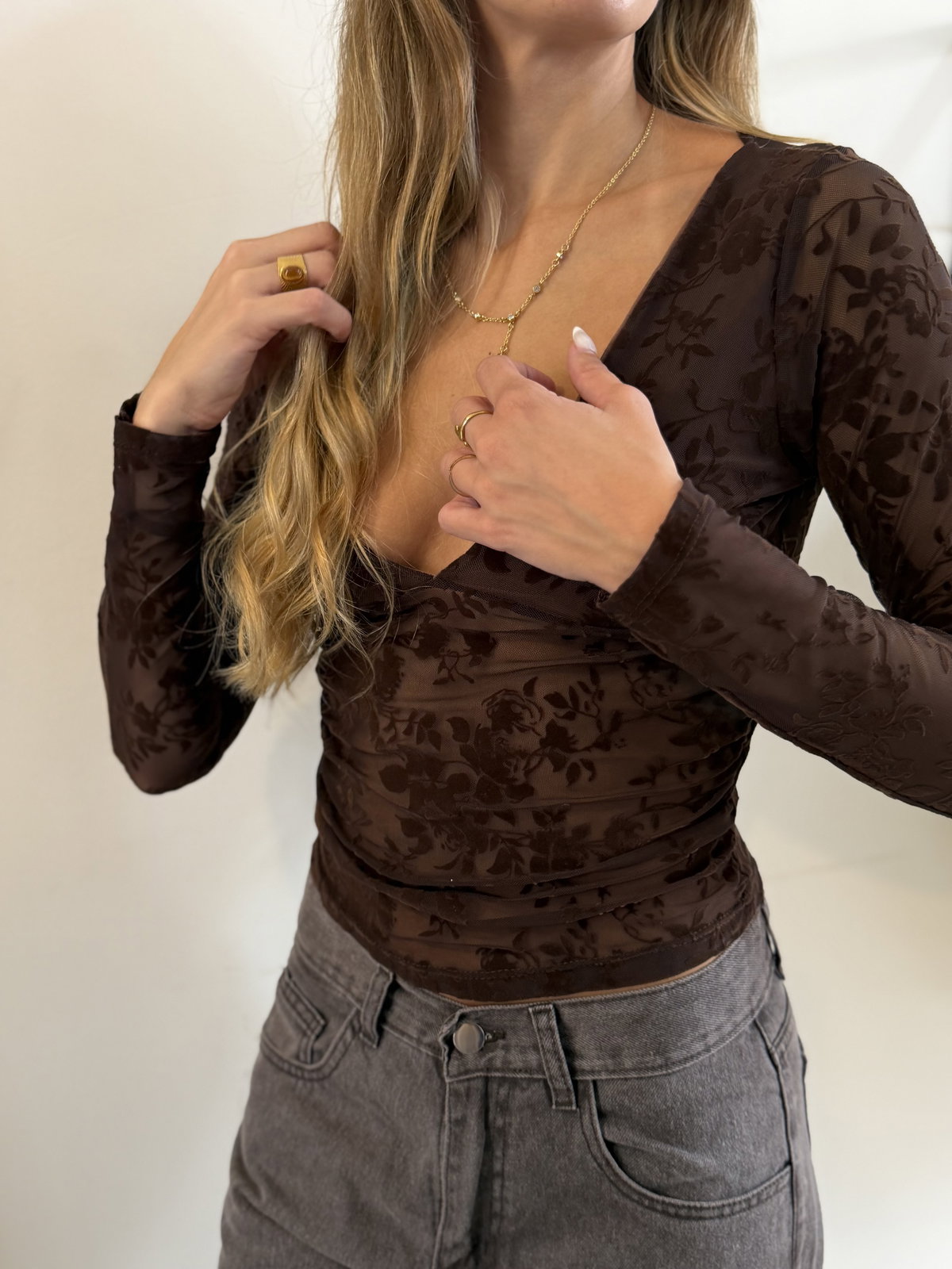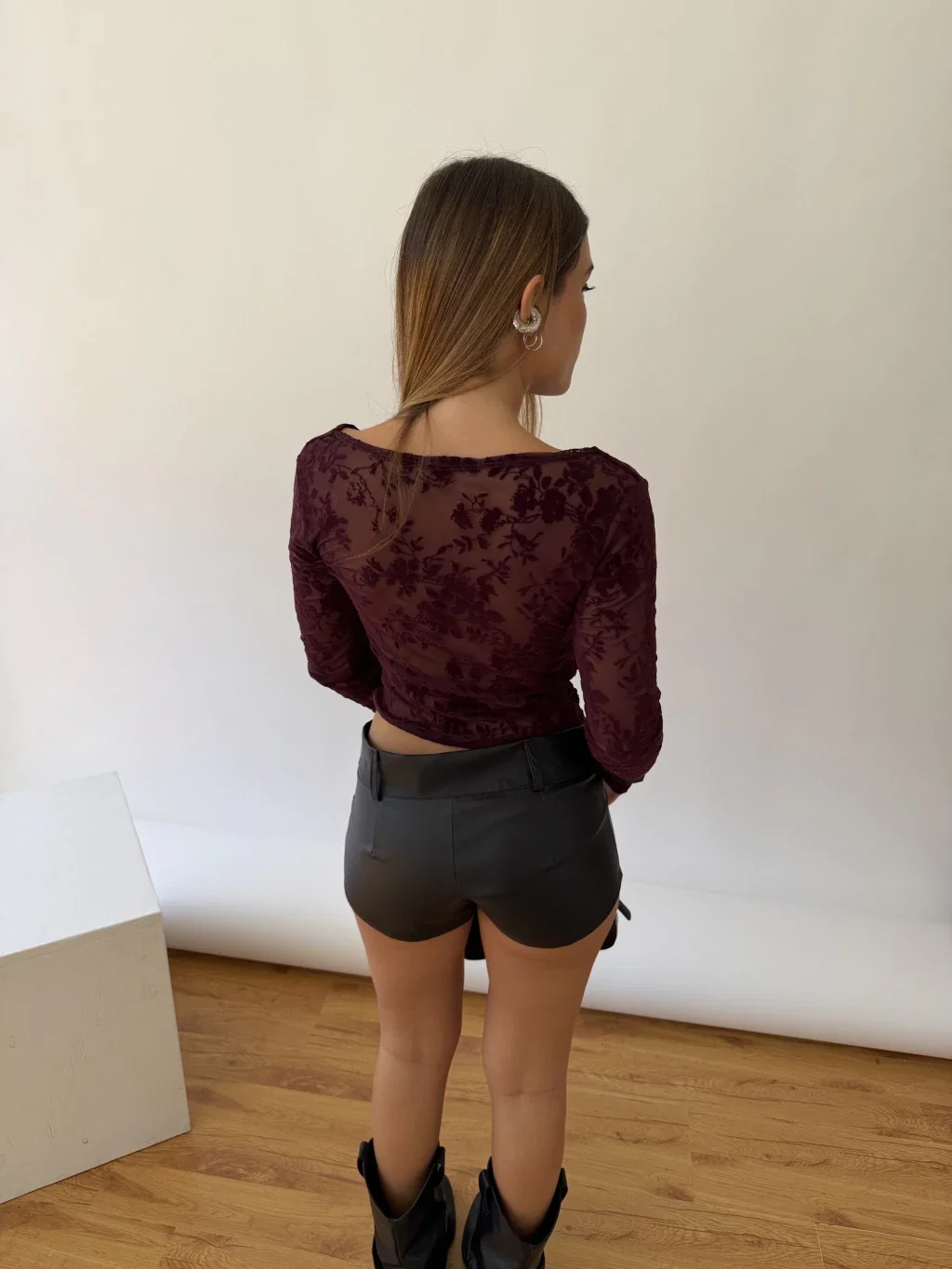 Top manga larga de microtul flock con recortes, forreria unicamente en busto con frunce en los costados.